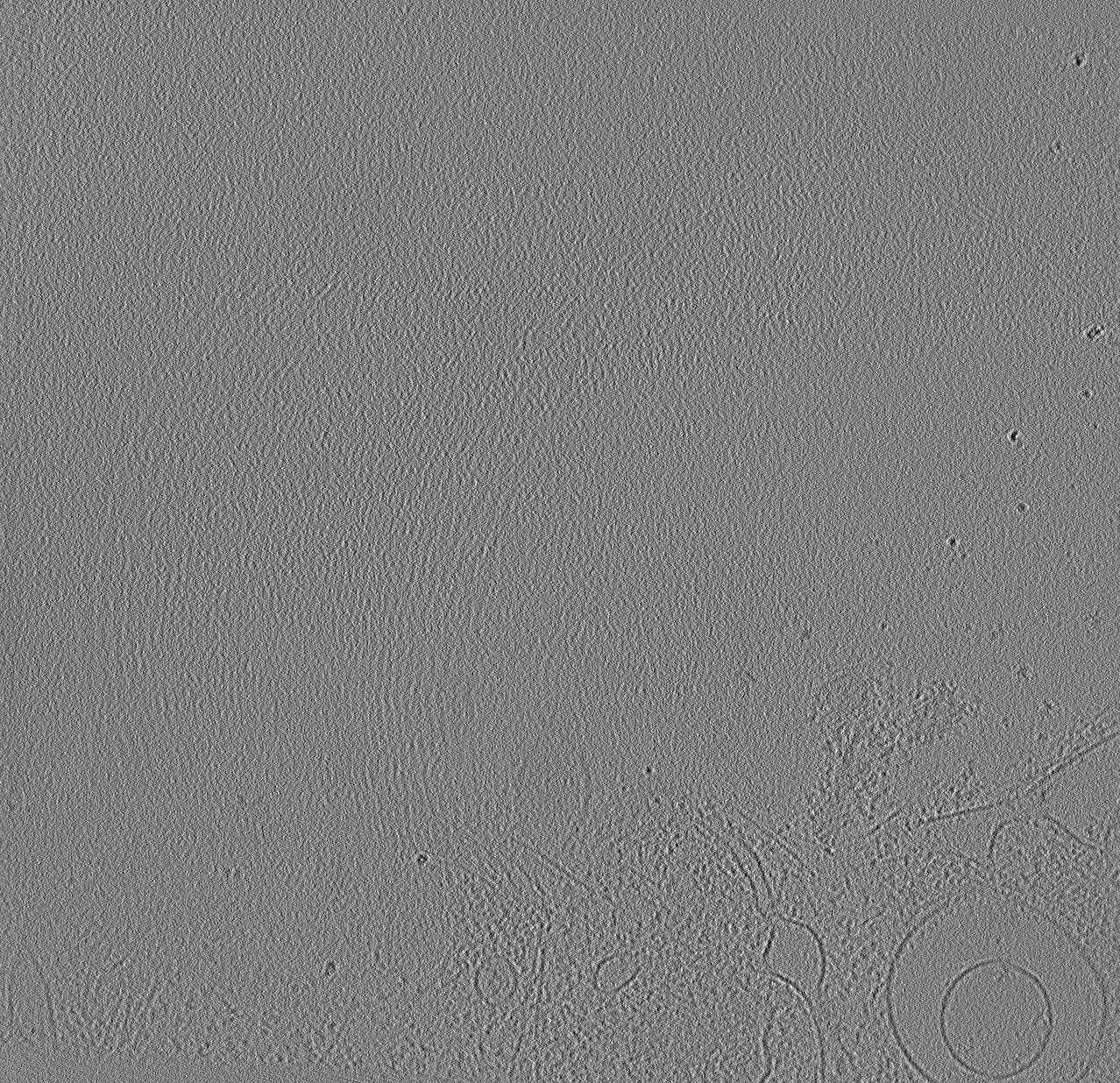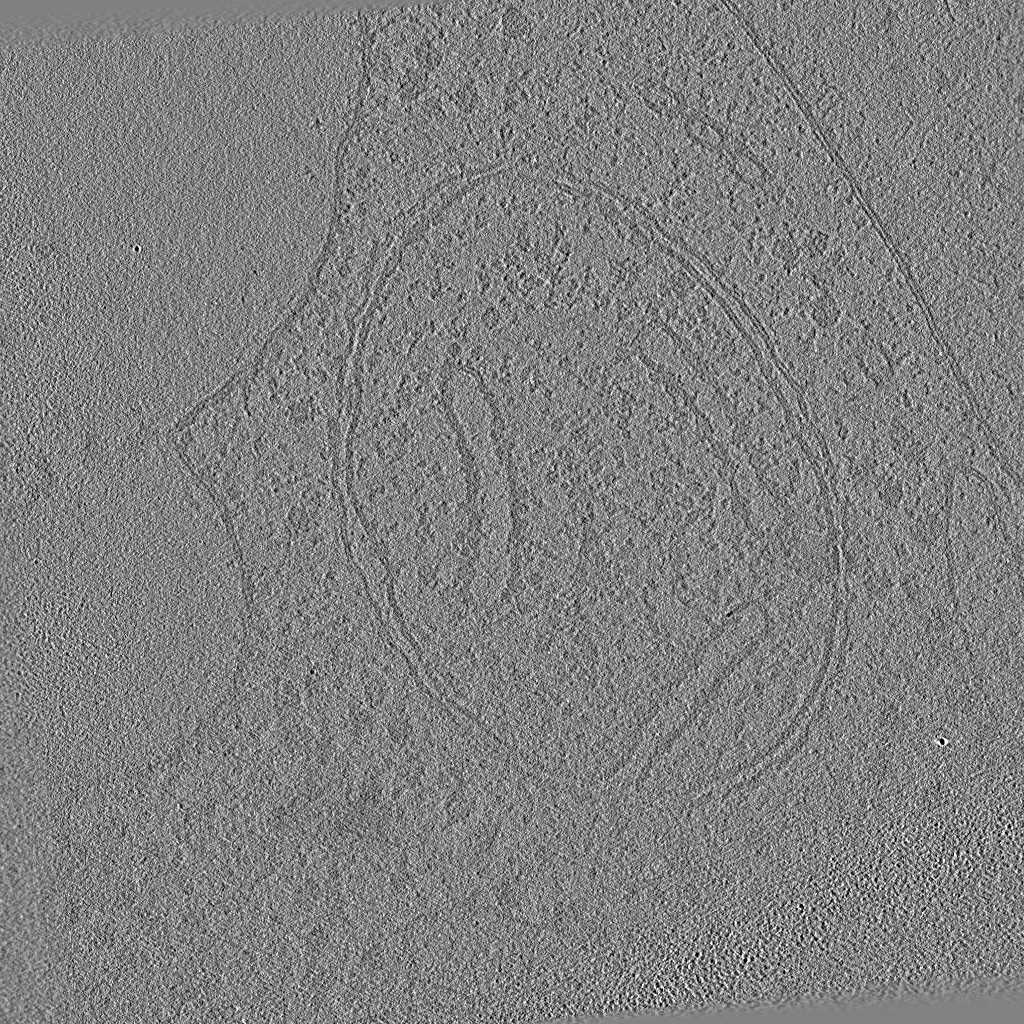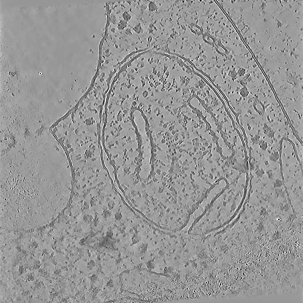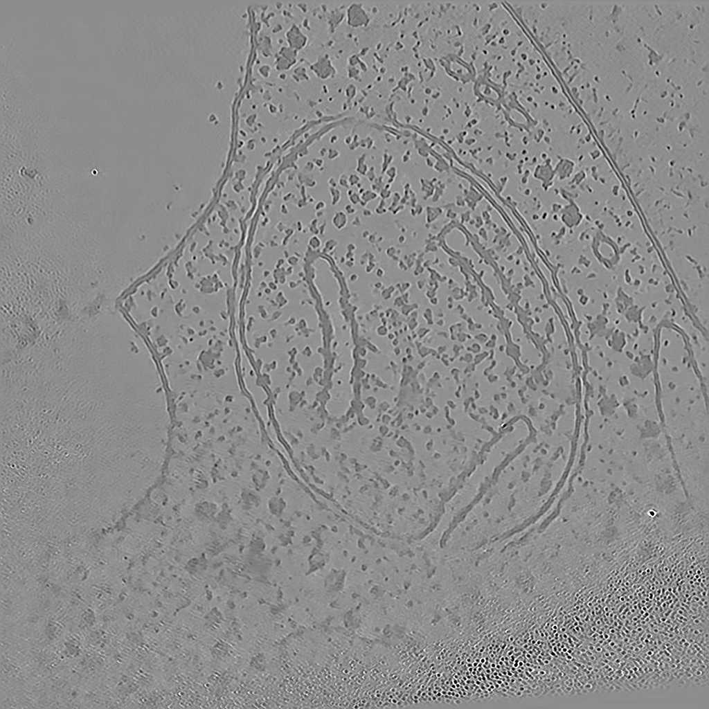 CryoLithe is a pre-trained model and yet it produces accurate reconstruction on new unseen dataset. Here, we apply CryoLithe to tilt-series from EMPIAR-12262, which contains non-infected cos-7 cells sampled at 5.525 Å/pixel. Crowded cellular environments are challenging to reconstruct accurately, a lot of overlapping features are projected onto the tilt series, and it becomes difficult to disentangle them.
